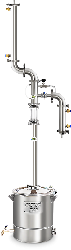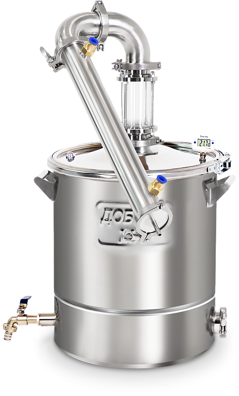 Электронный термометр установлен на крышке бака и в узле отбора, что позволяет контролировать температуру восходящих спиртовых паров.